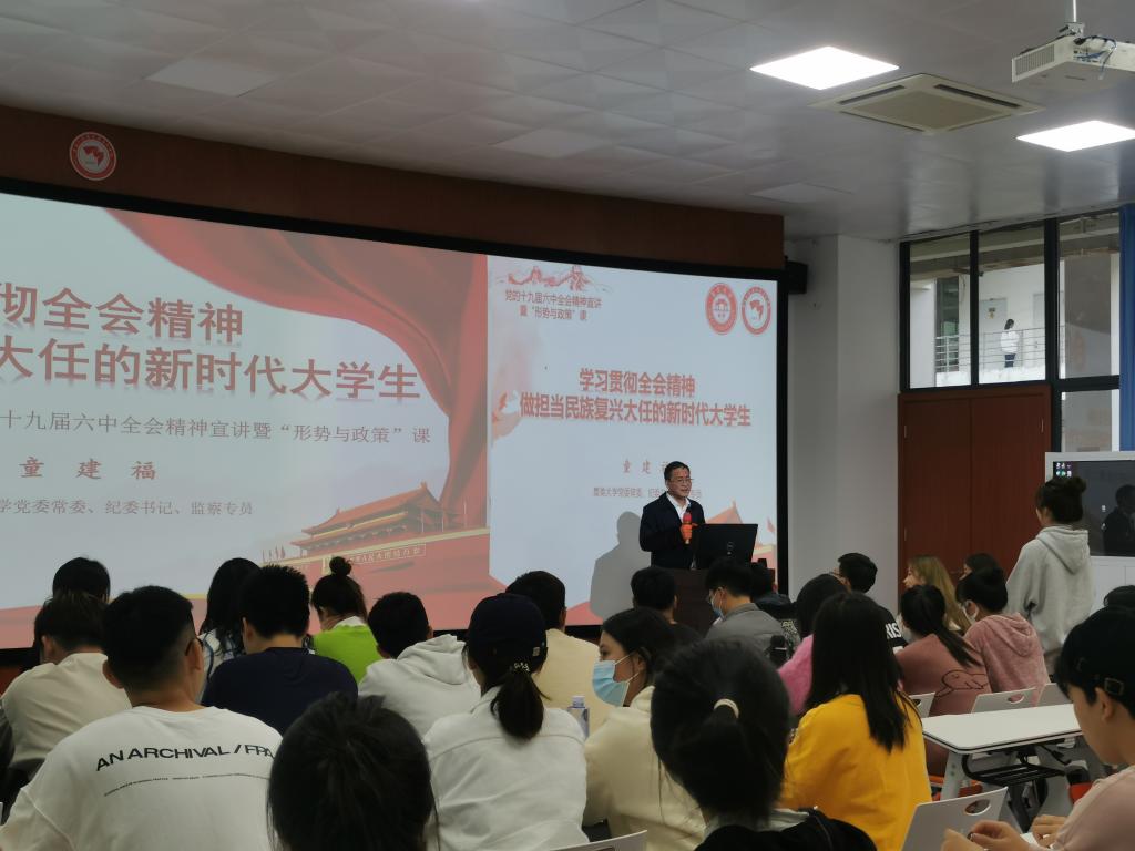 12月8日下午,校党委常委、纪委书记、监察专员童建福为所联系的音乐学院音乐学专业2020级学生上“形势与政策”课,作题为《学习贯彻全会精神,做担当民族复兴大任的新时代大学生》的宣讲报告。