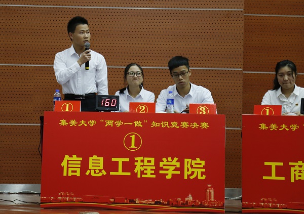为进一步推进“两学一做”学习教育的开展,创新学习教育形式,提高学习教育成效,校党委举办集美大学“两学一做”知识竞赛。11月23日下午,知识竞赛决赛在陈延奎报告厅举行,校党委副书记郑志谦,校党委常委、纪委书记童建福,校纪委、组织部、校团委及各学院党委负责人和师生代表一起观看了比赛。